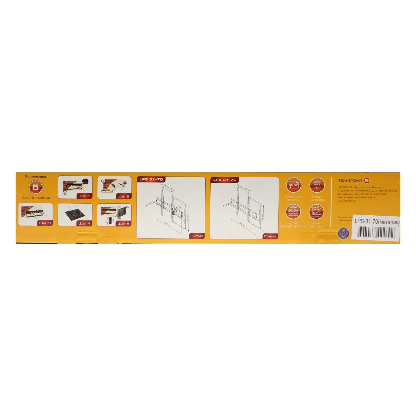 Лучшие цены. Кронштейн Trone LPS 31-70, для ТВ, наклонный, 32"-42", до 35 кг, 41 мм, серебристый -Вес: 1480 г. -Фасовка: 1 шт -Тип индивидуальной упаковки: Картонная коробка -Длина упаковки: 53 -Высота упаковки: 6 -Ширина упаковки: 10 -Объем упаковки: 3.180 -Объем продукта: 5.61 -Объем бокса: 39.27 -Материал: Металл -Температурное ограничение: Нет. Магазины в вашем городе.