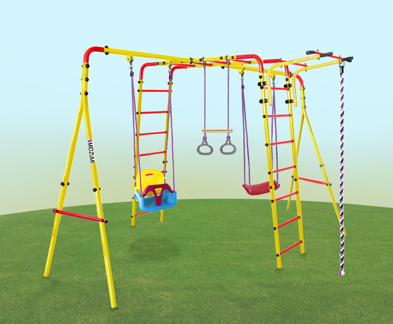 Лучшие цены. Торговый Дом Midzumi представляет Уличный Детский спортивный комплекс Midzumi Chikara в новом цветовом решении - солнечный день. Этот спортивный комплекс показывает разнообразие модельного ряда продукции Midzumi. Прочная металлическая конструкция позволяет выдерживать до 100 кг. Крепление Комплекса осуществляется с помощью бетонирования. Midzumi Chikara состоит из каркаса двух металлических лестниц с рукоходом, передвижного турника, двух разных навесных пластиковых качелей, каната и колец с перекладиной. Магазины в вашем городе.