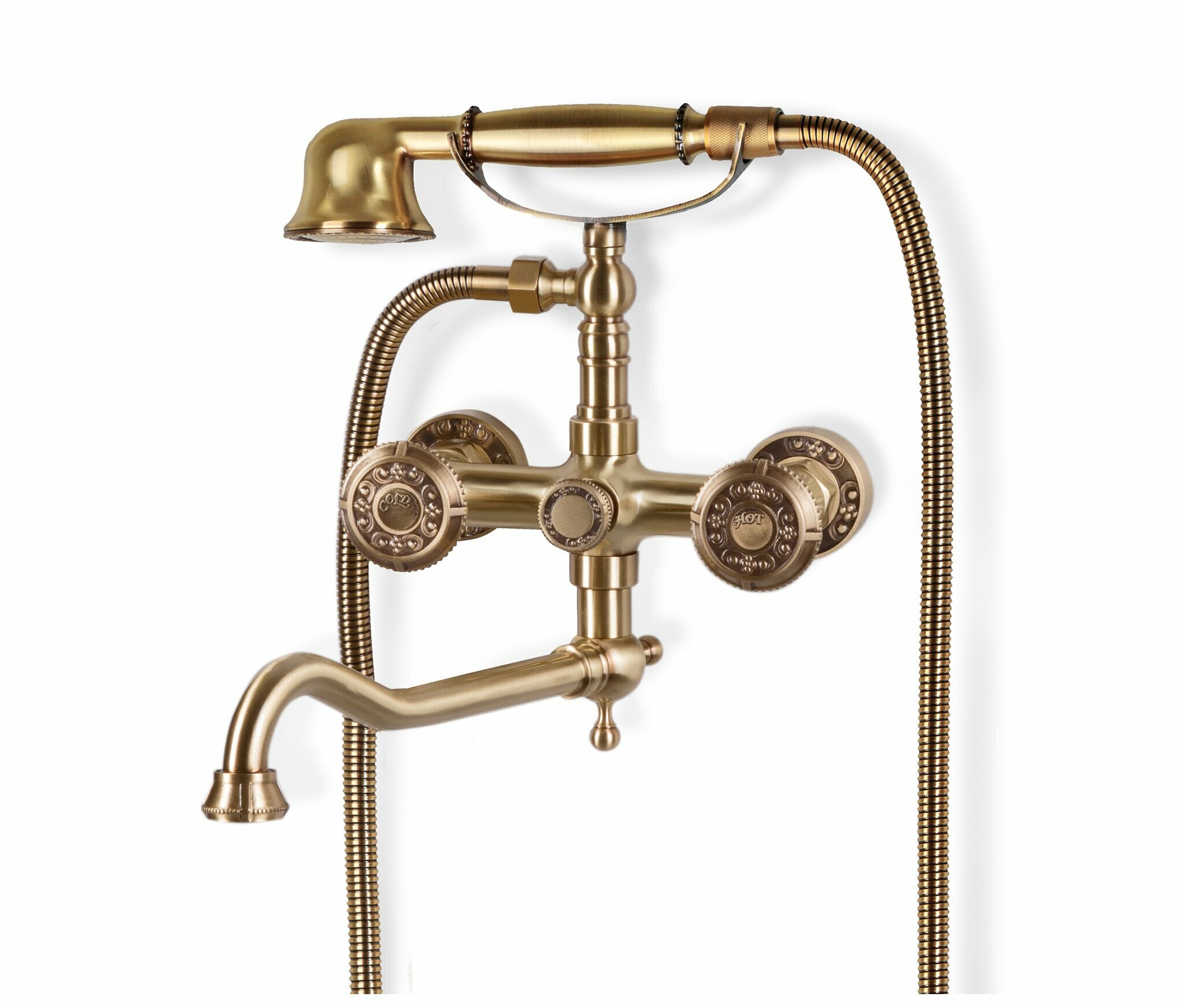 Лучшие цены. для ванны и душа, цвет: бронза, на стену, длина излива: 249 мм, двухзахватный, высота смесителя: 100 мм, 2, 1/2 дюйма, латунь, классический, округлая, жесткая, 2, керамический, поворотный излив, лейка со шлангом. Магазины в вашем городе.