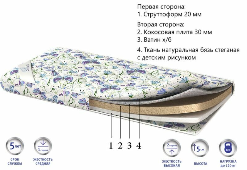 Лучшие цены. Беспружинный детский матрас Corretto Senza molle при высоте 5 см состоит из 3-х наполнителей: кокосовой койры, струттофайбера и ватина. Они обеспечивают разные степени жёсткости спального места и невысокую цену изделия. Жёсткую сторону формирует кокосовая плита толщиной в 3 см. Этот природный материал отличается прочностью, гигиеничностью и гипоаллергенностью. Спать на твёрдой поверхности особо рекомендуется младенцам и дошкольникам. Тонкий слой ватина поверх кокоса делает сон более комфортным. Магазины в вашем городе.