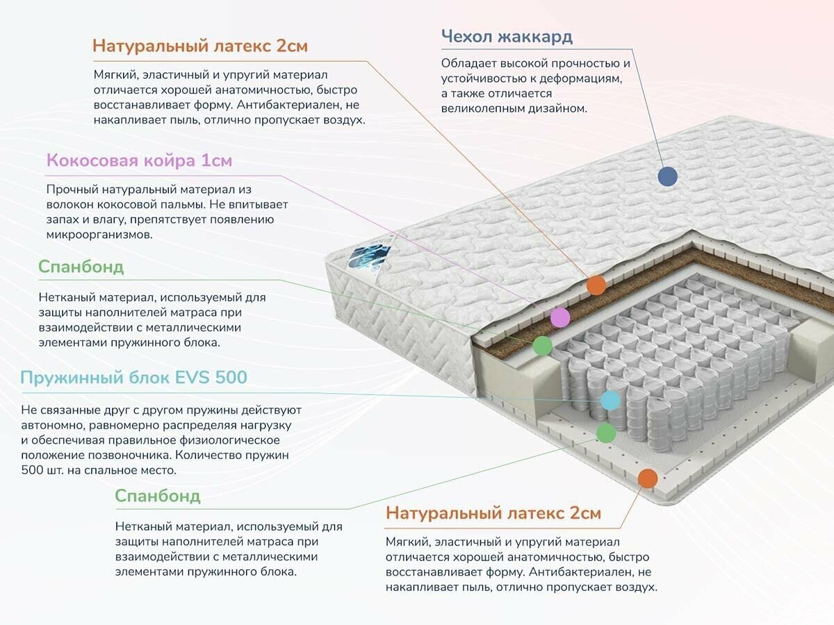 Лучшие цены. Автономный пружинный блок, является основой Практик Медиум Софт 500. Частые пружинки из прочной проволоки, помещены в нетканые чехлы. Пружины обеспечивают ортопедическую поддержку позвоночнику и здоровый сон. Натуральные наполнители выложены по обе стороны от пружинного блока. Только по одной стороне расположился натуральный латекс, а по другой, его сочетание с койрой кокоса. Оба материала хорошо вентилируются, не накапливают посторонние запахи и влагу, обладают высокой прочностью и долговечностью. Магазины в вашем городе.