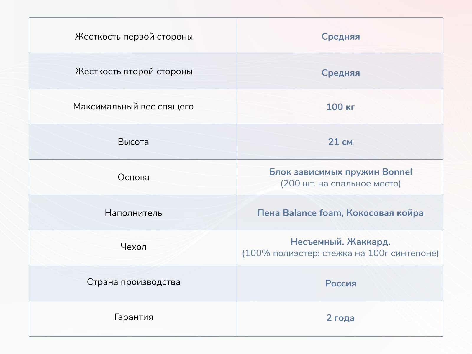 Лучшие цены. Практик Медиум Лайт Bonnel в основе своей содержит блок из биконусных пружин свитых из прочной проволоки особым способом. По периметру блока проложены пенные блоки для укрепления конструкции и увеличения срока эксплуатации. Слои наполнения чередуются из двух материалов, в зеркальном расположении от пружинного блока. Койра кокса - прочная, жесткая, придает матрасу ортопедических свойств и ровности. Магазины в вашем городе.
