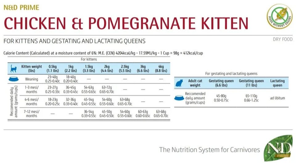 Лучшие цены. Полнорационный беззерновой корм Farmina N&D для котят, беременных и лактирующих кошек. Особенности Только высококачественные ингредиенты. С курицей и гранатом. Без искусственных консервантов Не содержит зерновых. Состав свежее мясо курицы без костей (30%), дегидратированное мясо курицы (28%), картофель, куриный жир, дегидратированные цельные яйца, свежая сельдь, дегидратированная сельдь, рыбий жир, гидролизат животных белков, волокна гороха, сушеная морковь, сушеная люцерна, инулин, фруктоолигосахариды. Магазины в вашем городе.