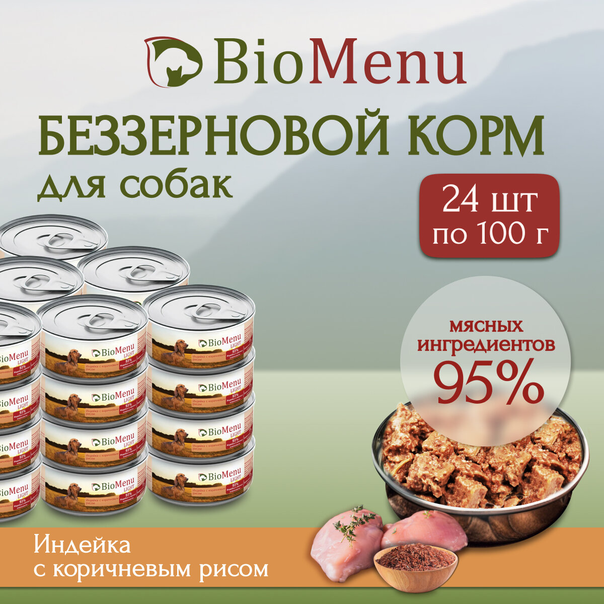 BioMenu LIGHT Консервы д/собак Индейка с коричневым рисом 93%-мясо 100гр x 24 шт