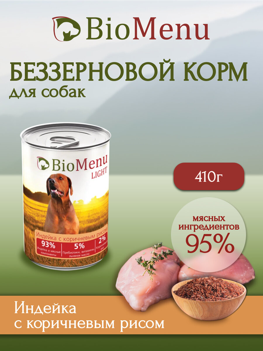 BioMenu LIGHT Консервы для собак Индейка с коричневым рисом 93%-мясо 410г (12шт)