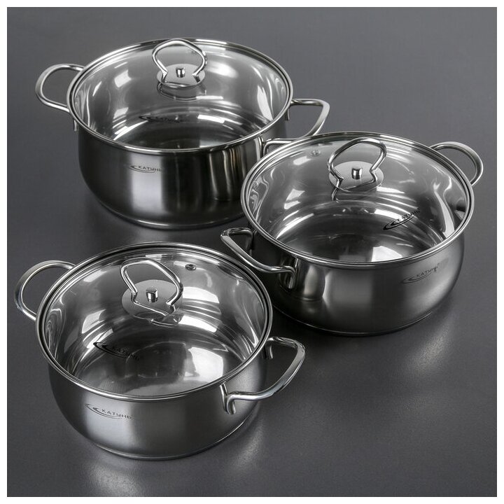Лучшие цены. Набор кастрюль катунь Лира из нержавеющей стали, незаменим на каждой кухне. Набор состоит из 6 предметов: кастрюль 2,2, 3,2 и 4,2 литра, а так же 3 крышек из термостойкого стекла. Благодаря трехслойному дну с алюминиевой прослойкой кастрюли подходят для всех типов плит, не деформируются, равномерно распределяют тепло. Каждая кастрюля оборудована двумя литыми ручками из нержавеющей стали, стеклянные крышки позволяют контролировать процесс приготовления. Магазины в вашем городе.