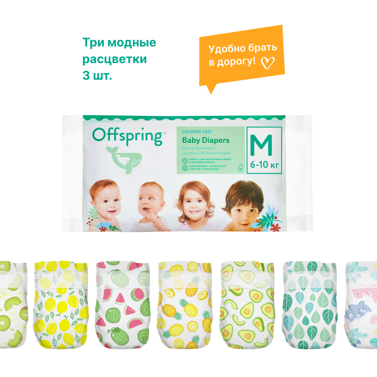 Дорожная упаковка. Эко-подгузники Offspring, размер M 6-10 кг. 3 шт. 3 цвета