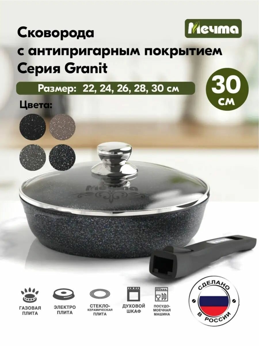 Сковорода Мечта 30см Гранит с антипригарным покрытием со съемной ручкой и крышкой с030701