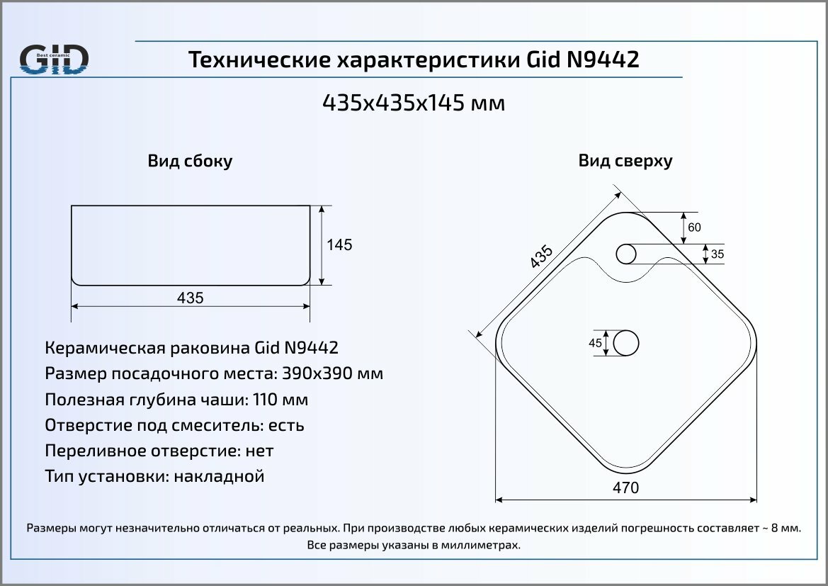 (44х44х14см) Керамическая накладная раковина Gid N9442