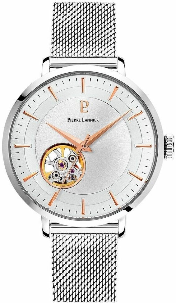 Лучшие цены. Женские механические часы с автоподзаводом. Центральные часовая, минутная и секундная стрелки. Серебристый циферблат с открытым балансом хода. Круглый корпус выполнен из полированной нержавеющей стали. Диаметр корпуса составляет 37 мм, толщина 11,9 мм. Стальной браслет шириной 16 мм выполнен в технике миланского плетения, раскладная застежка. Прочное минеральное стекло устойчивое к мелким механическим повреждениям. Водостойкость WR 30 (брызги). В комплекте розовый кожаный ремешок. Магазины в вашем городе.