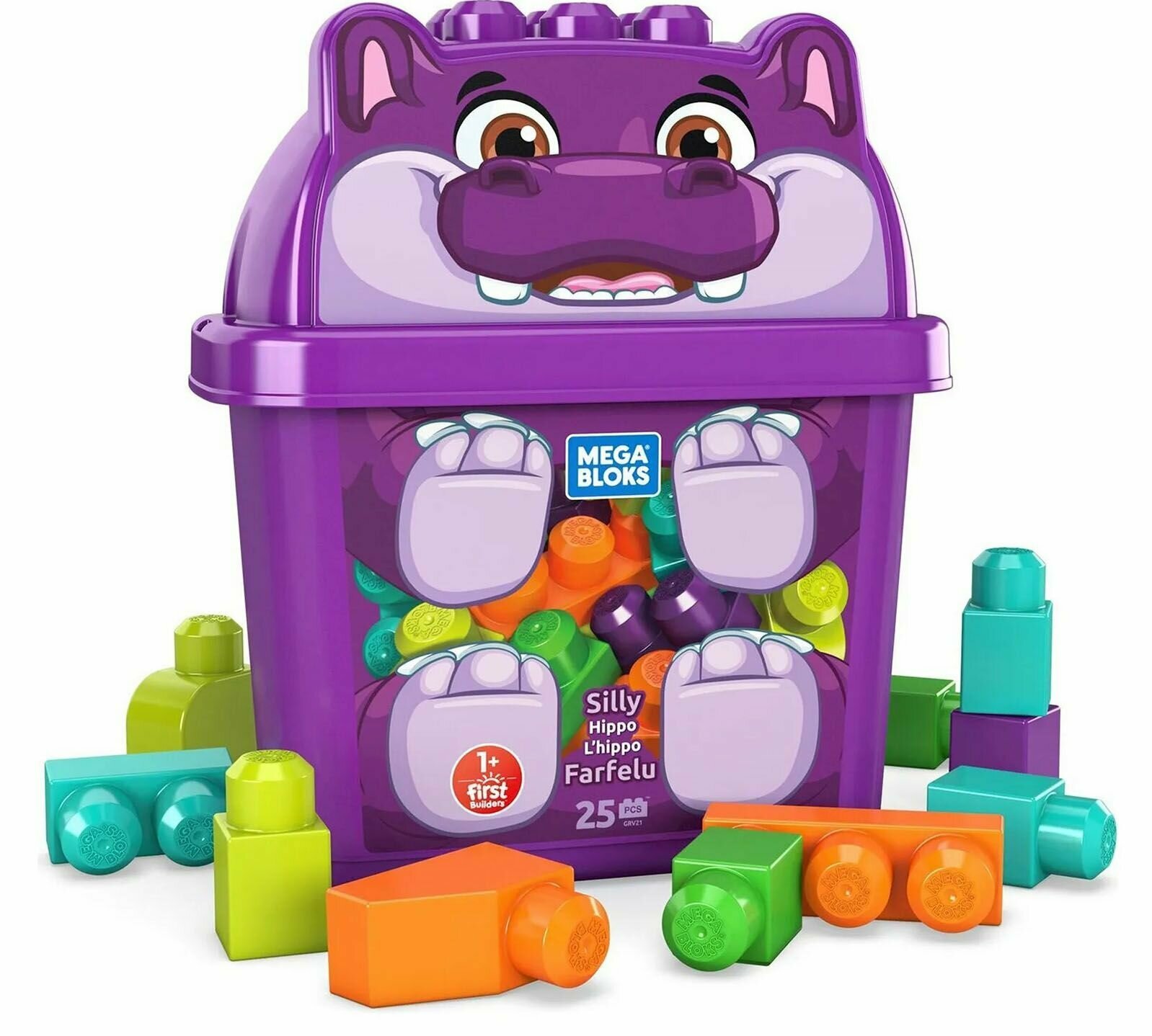 Лучшие цены. Представляется набор яркого конструктора из строительных блоков от бренда MEGA BLOKS, предназанченный для малышей. Способствует развитию фантазии ребенка, пространственного мышления, внимания и тренирует мелкую моторику. Кубики хранятся в удобном контейнере, в форме бегемотика, тренировать мелкую моторику. Данный набор хорошо комплектуется с любыми другими наборами MEGA BLOKS. Основные цвета кубиков: Желтый, Голубой, Зеленый, Оранжевый, Фиолетовый. В наборе содержатся: 25 деталей, контейнер для хранения. Магазины в вашем городе.
