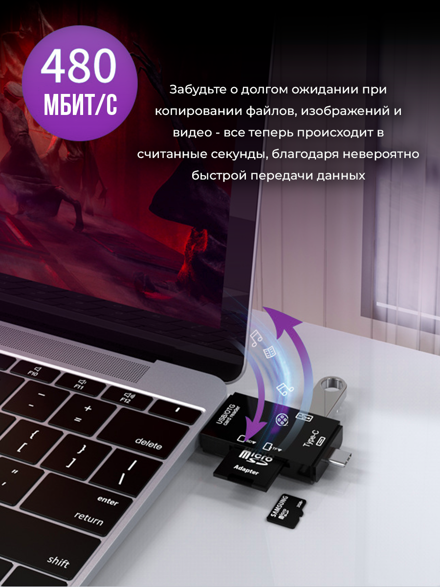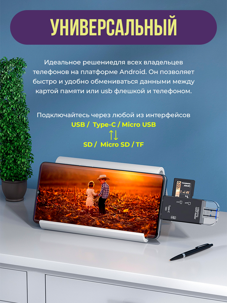 Лучшие цены. Универсальный картридер 6 в 1 со слотами для чтения карт памяти: SD, micro SD, TF. В котором предусмотрены слоты для чтения карт памяти. С его помощью можно быстро перенести информацию с карточки на разные носители - ноутбук, планшет, компьютер, телефон и его удобно брать с собой. В картридере предусмотрены USB, mirco USB, type-C. Информация, хранящаяся на карте, читается card reader непосредственно на смартфоне. Гарантирует высокую скорость записи и чтения. Установка дополнительных драйверов не требуется. Магазины в вашем городе.