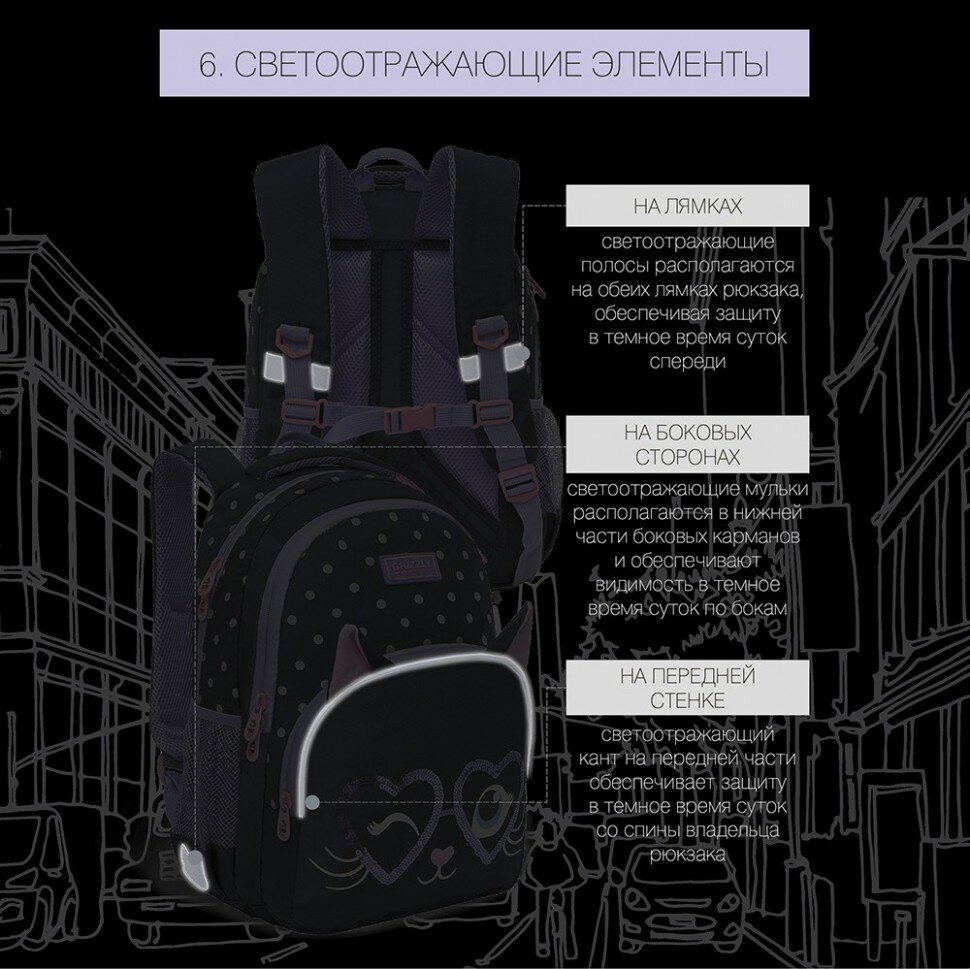 Рюкзак школьный для девочки подростка, с ортопедической спинкой, для средней школы, GRIZZLY, с котом (черный)