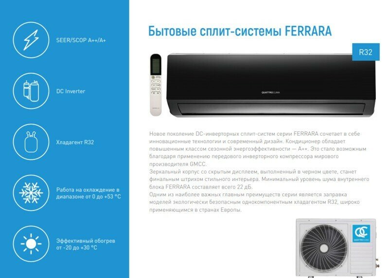 Лучшие цены. Новое поколение DC-инверторных сплит-систем серии Ferrara сочетает в себе инновационные технологии и современный дизайн. Кондиционер обладает повышенным классом сезонной энергоэффективности — А++, а также способен эффективно работать в режиме обогрева при температуре за окном до -20 °C. Это стало возможным благодаря применению инверторного компрессора торговой марки GMCC. Зеркальный корпус со скрытым дисплеем, выполненный в черном цвете, станет финальным штрихом стильного интерьера. Магазины в вашем городе.