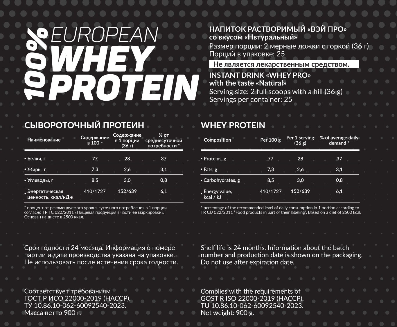 Протеины Напиток растворимый "ВЭЙ про" Be Steel Nutrition 100% European Whey Protein 0,9кг (натуральный)