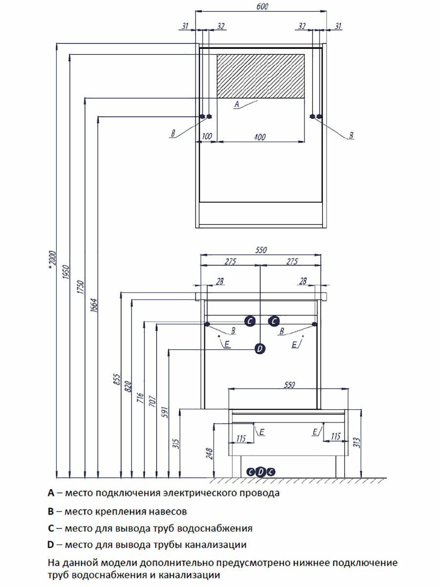Тумбы под умывальник Тумба под раковину AQUATON Капри 60 1A230101KP010 550x429x505 подвесная, 2 ящика, белый глянец