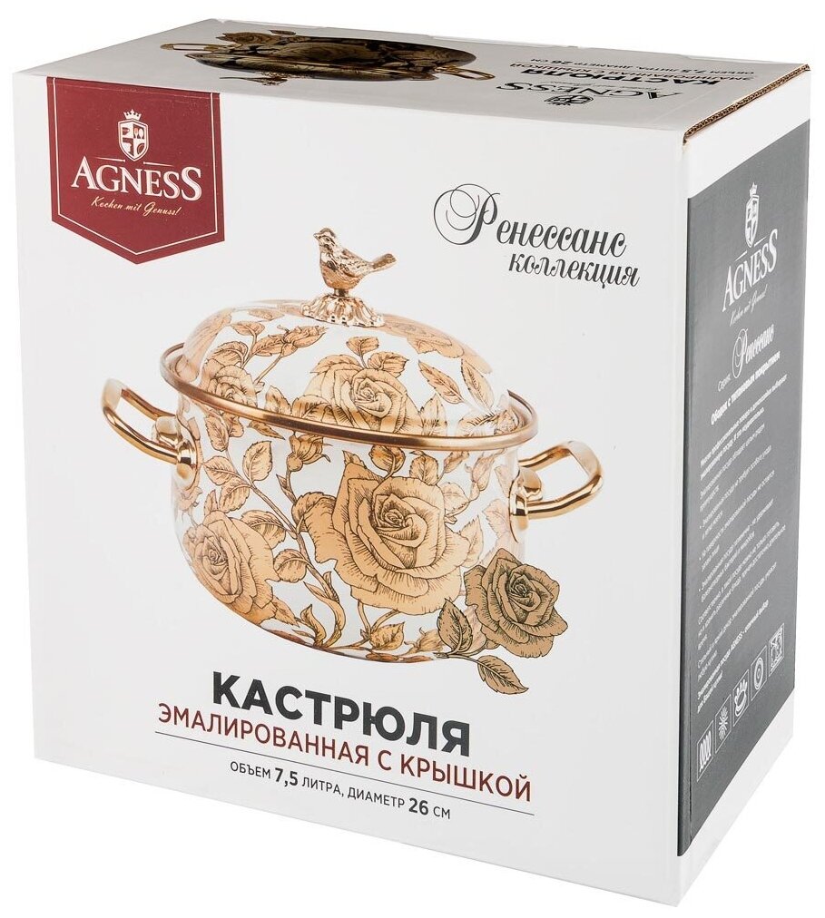 Кастрюля agness эмалированная с крышкой, серия ренессанс 7,5л, диа.26см подходит для индукцион.плит KSG-950-158