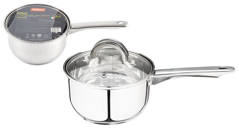 Лучшие цены. Ковш из нерж стали с крышкой, объем1,9 л, размер:16*9,5 см, серия "Mediano", тм Mallony Размер: 16*9,5 см, объем - 1,9 л, 201 нержавеющая сталь, толщина - 0,4 мм, дно 3-слойное капсулированное - 0,2 мм нерж сталь 201 +1мм алюминия + 430 сталь 0,5 мм (толщина дна - 1,7 мм), подходит для индукции, снаружи и внутри - зеркальная полировка, полые ручки из нерж стали, С-тип крышка из жаропрочного стекла с отверстием для выпуска пара. Отметки литража. Магазины в вашем городе.