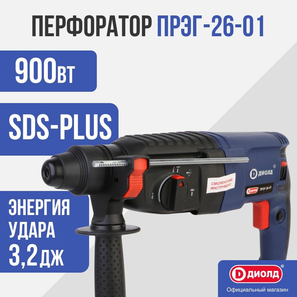 Перфоратор диолд ПРЭГ-26-01 в кейсе / регулировка частоты, 900 Вт, 3,2 Дж, 3 режима, SDS+, механический щеточный реверс, буры, пика, зубило, от сети, российский производитель