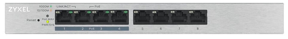 ZYXEL GS1200-8HPV2-EU0101F Коммутатор 8xGE 4xPoE+ , настольный, бесшумный без вентилятора , с поддержкой VLAN, IGMP, QoS и Link Aggregation, бюджет PoE 60 Вт