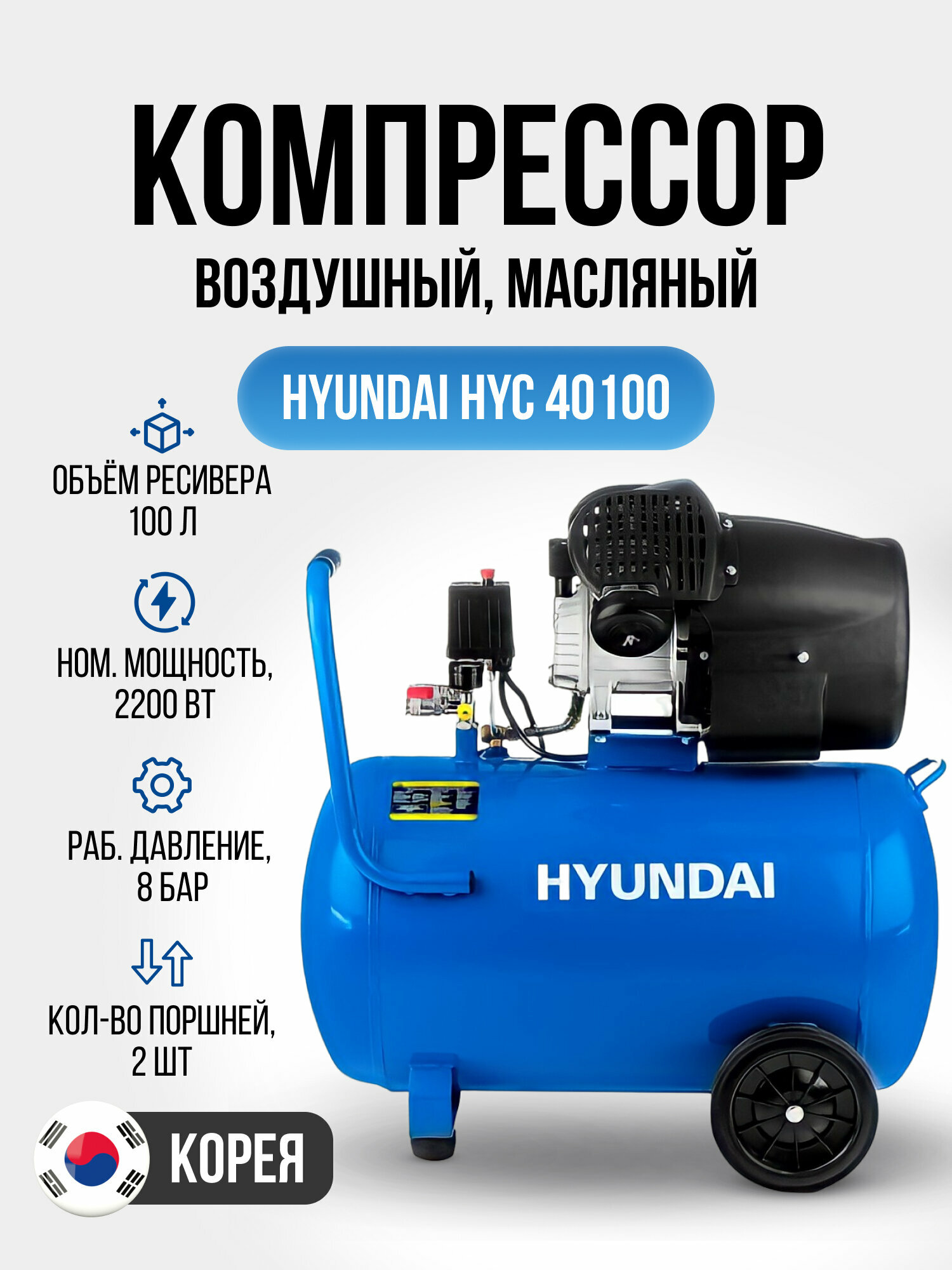 Компрессор масляный HYUNDAI HYC 40100 поршневой, коаксиальный (прямой) привод.