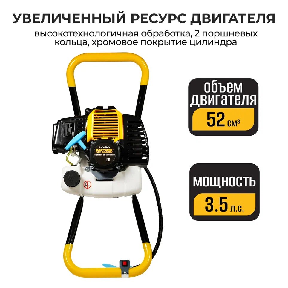 Лучшие цены. Мощный и высокоскоростной агрегат – мотобур PARTNER FOR GARDEN EDG 520 позволяет быстро справляться с бурением отверстий необходимого диаметра и значительно упрощает проведение различных работ. Бензобур торговой марки PARTNER FOR GARDEN может использоваться для бурения лунок, предназначенных для бурения в саду, а также при проведении строительных работ, установки ограждений. Магазины в вашем городе.