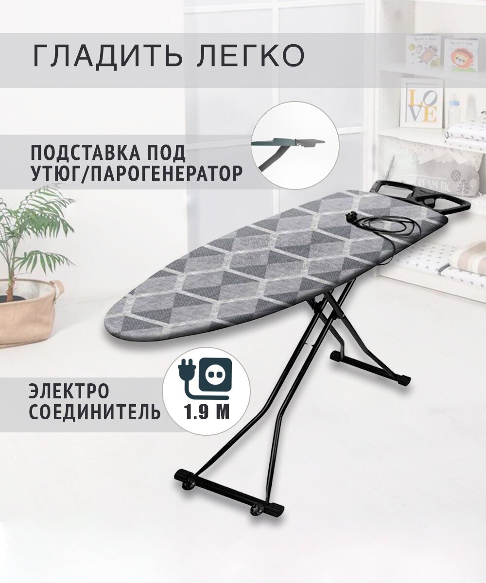 Складная гладильная доска для белья / гладильная доска для парогенератора Ника Sport (NS/2 в стиле абстрактный, встроенная розетка, напольная, широкая, подставка под утюг, плавная регулировка высоты, шнур 1.6м)