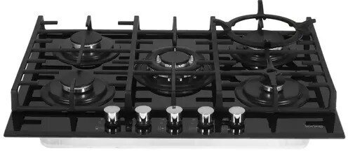Встраиваемая газовая панель Korting/ Газовая варочная панель из закаленного стекла, ширина 70 см, 5 высокоэффективных конфорок, сверхмощная конфорка WOK 3,8 кВт, автоматический электроподжиг, газ-контроль каждой конфорки, передние металлические переключат