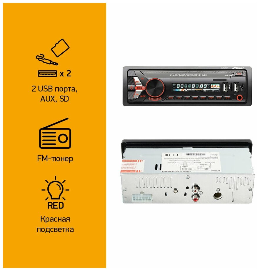 Автомагнитола Digma DCR-390R 1din, 4x45Вт, подсветка, 12 В, USB, SD/MMC, FM
