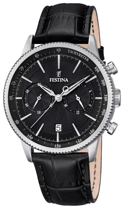 Лучшие цены. Мужские кварцевые аналоговые наручные часы-хронограф с секундомером и тахиметром. Коллекция Festina Chronograph. Тахиметр предназначен для расчета скорости на основании времени в пути. Отображение времени в формате 12/24. Круглый стальной корпус . Кожаный ремешок. Магазины в вашем городе.