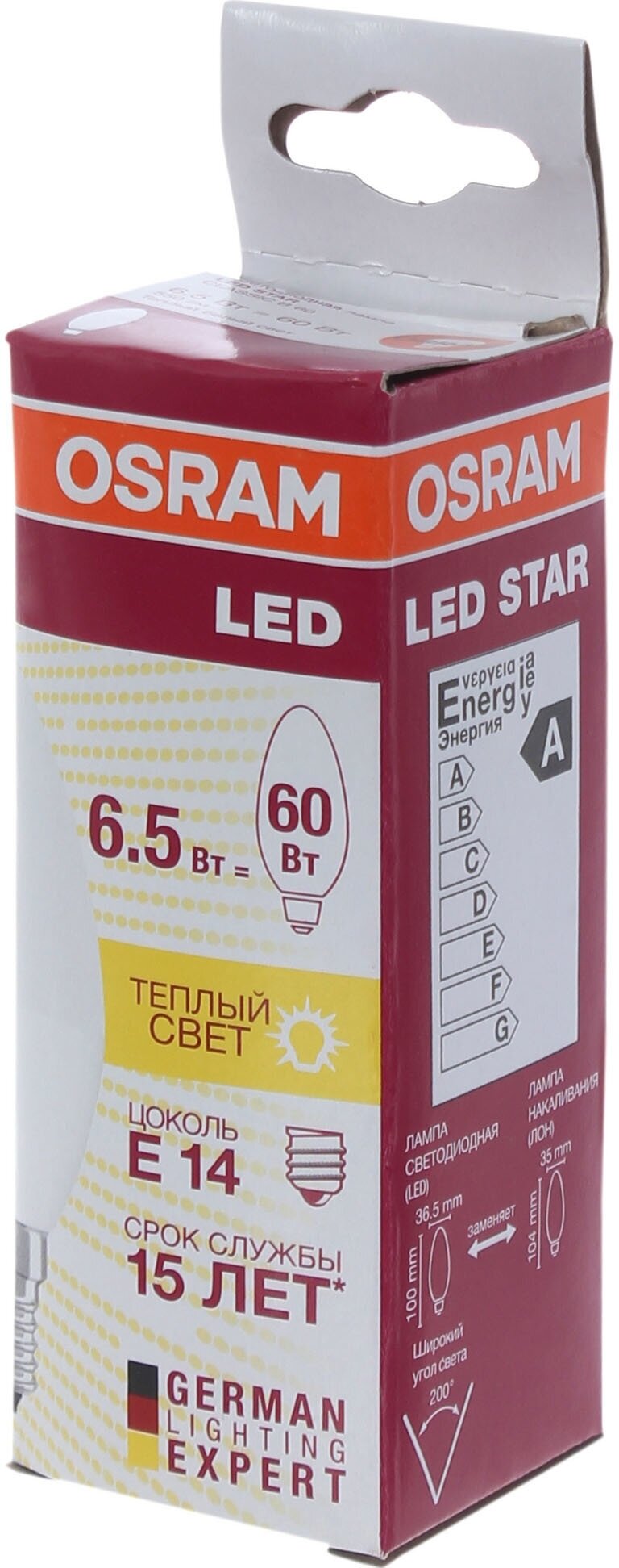Лампа OSRAM LED Star E14 свеча B C37 6.5Вт, светодиодная LED, 550 лм, эквивалент 60Вт, тёплый свет 3000К