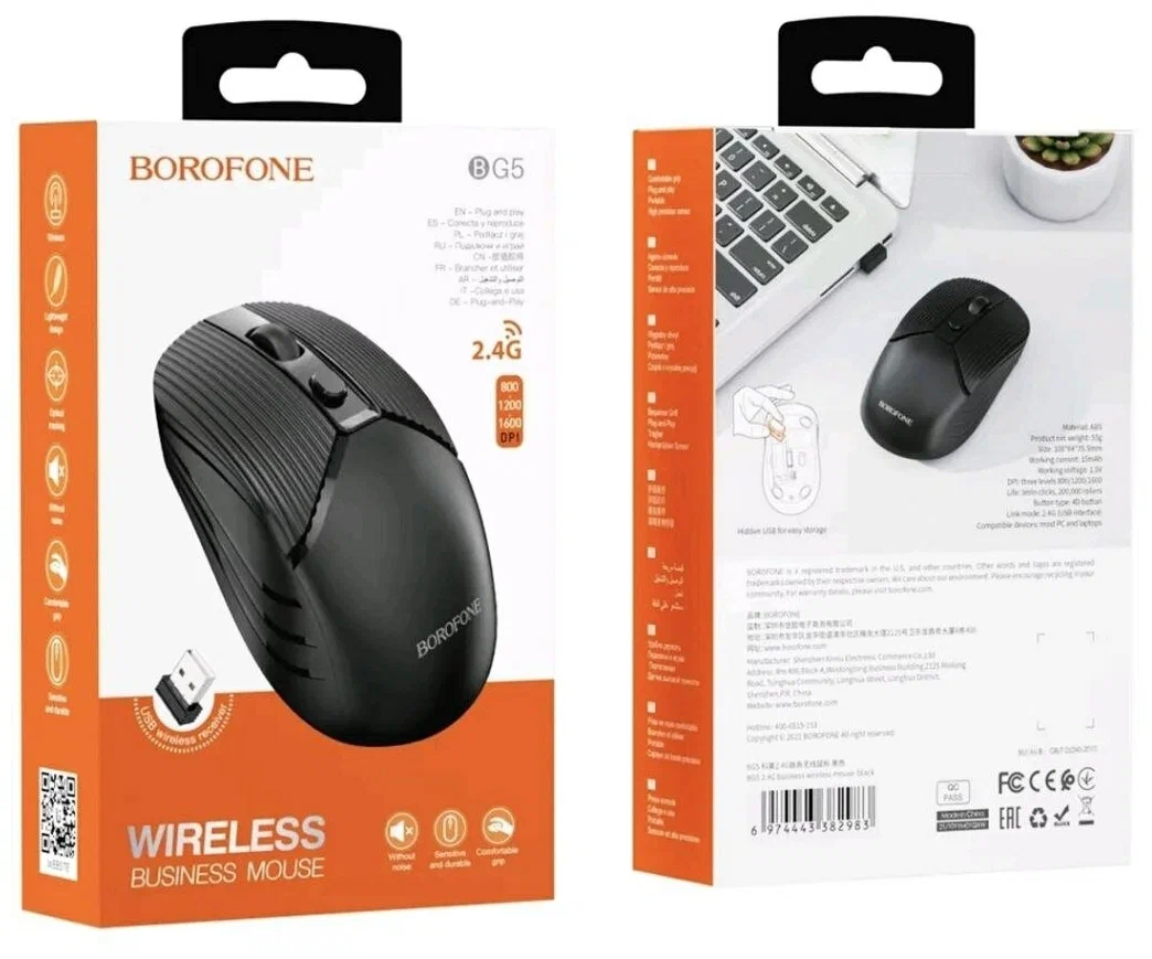 Мышь Borofone BG5, беспроводная, оптическая, 1600 dpi, от одной батарейки ААА, чёрная, цвет чёрный