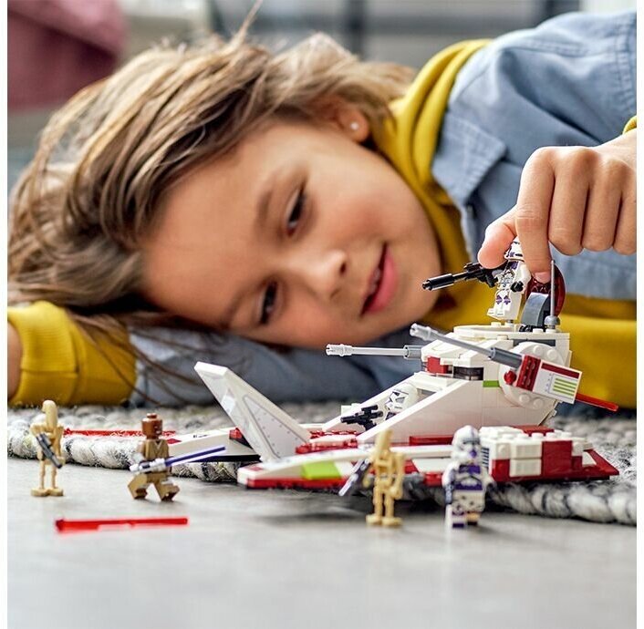 Лучшие цены. Фанаты «Звездных войн : Войны клонов» могут разыграть захватывающие сражения между солдатами-клонами 187-го легиона Мейса Винду и боевыми дроидами на этом собранном из кубиков Республиканском истребителе LEGO® (75342). Он имеет скрытые колеса для эффекта парения, 2 подъемных пружинных шутера и смотровую площадку для командира клонов наверху. В набор входят 4 минифигурки LEGO: Мейс Винду и новые версии командира и солдата клонов 187-го легиона, выпущенные в мае 2022 года, а также 2 боевых дроида — все с. Магазины в вашем городе.