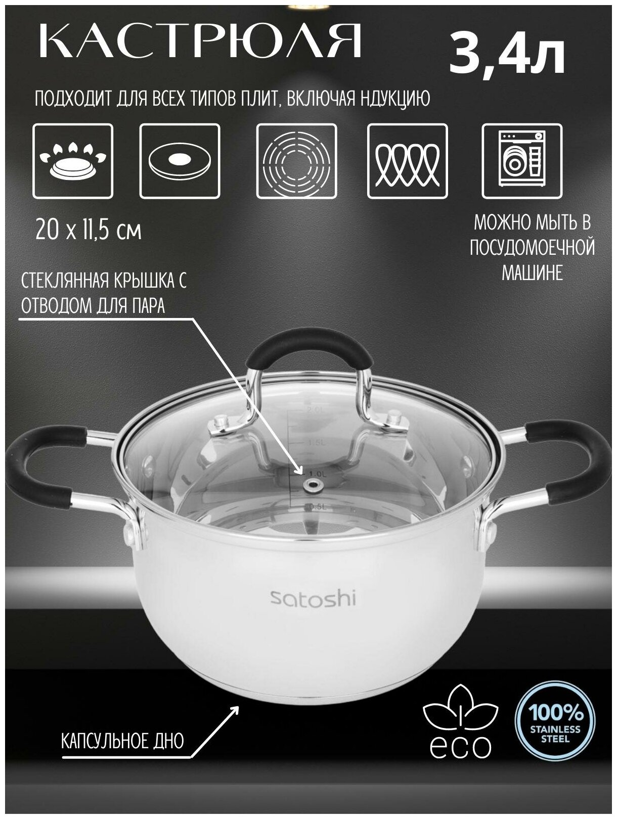 SATOSHI Альбер Кастрюля 20х11,5см, 3,4л, со стекл. крышкой, индукция