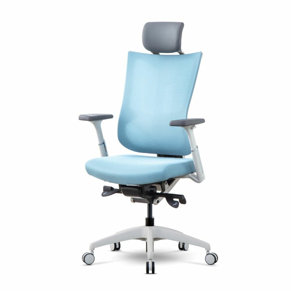 Компьютерные кресла Эргономичное компьютерное кресло для офиса Schairs Tone-M01W (Южная Корея), с подголовником и поясничной поддержкой, регулировка высоты газлифт, синхронный механизм качания, обивка сетка голубой