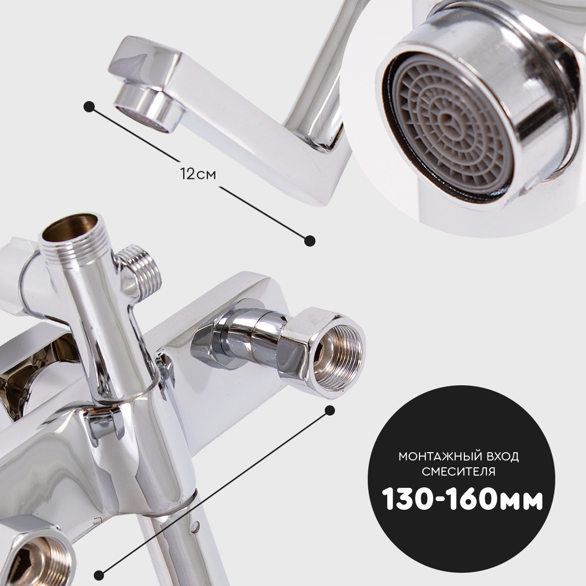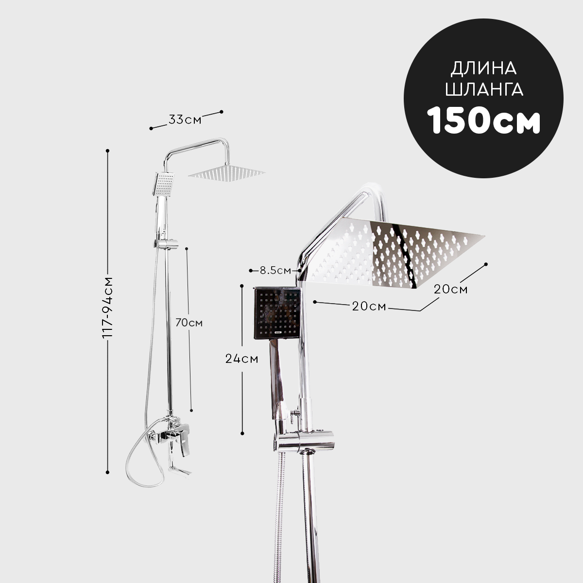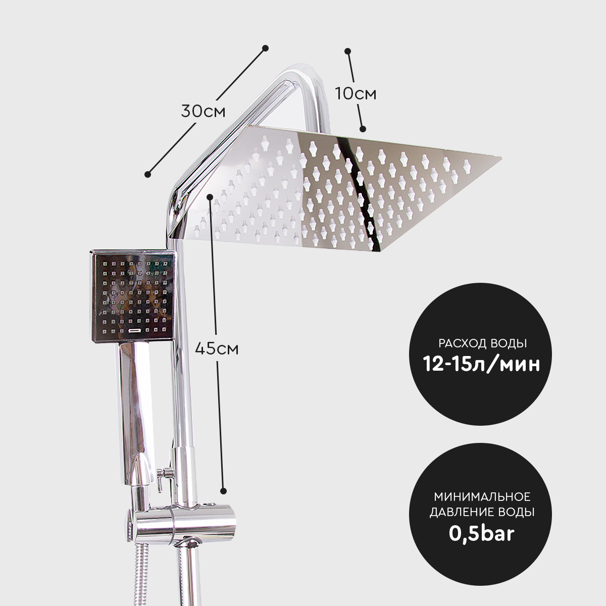 | Комплектация | ручной душ (душевая лейка) / верхний душ (тропический) / смеситель / стойка / штанга / душевой шланг / крепление ручного душа |