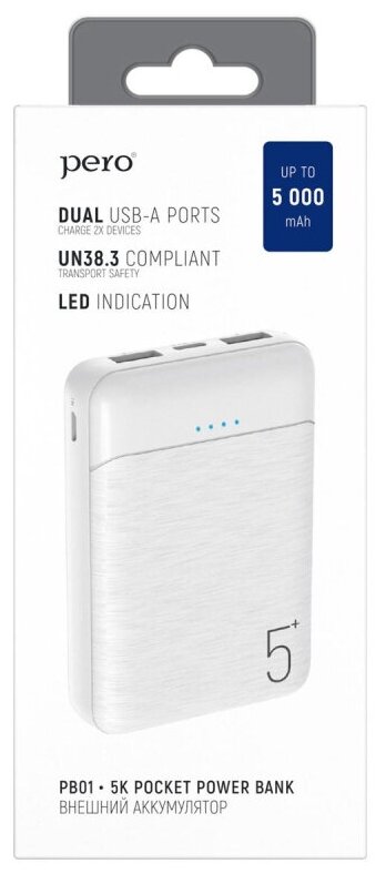 PERO Внешний аккумулятор PERO PB01, 5000 мАч, 2 USB, 2.1 А, индикатор, белый