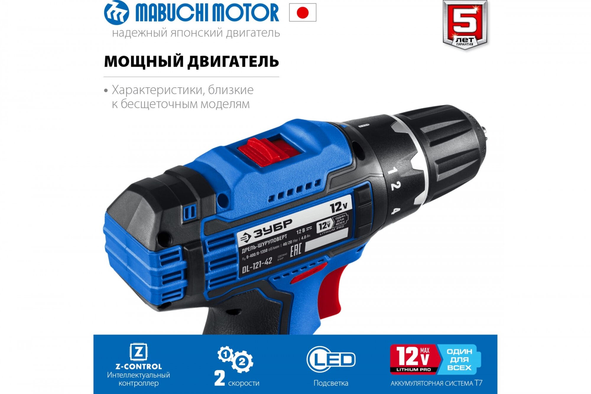 Дрель-шуруповерт Зубр DL-121-42 12В, 2 АКБ (4Ач), в сумке