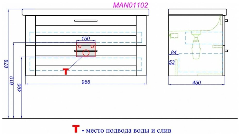 Модуль под раковину Aqwella Manchester 101х46х54см, арт. MAN01102, 2 ящика, белый