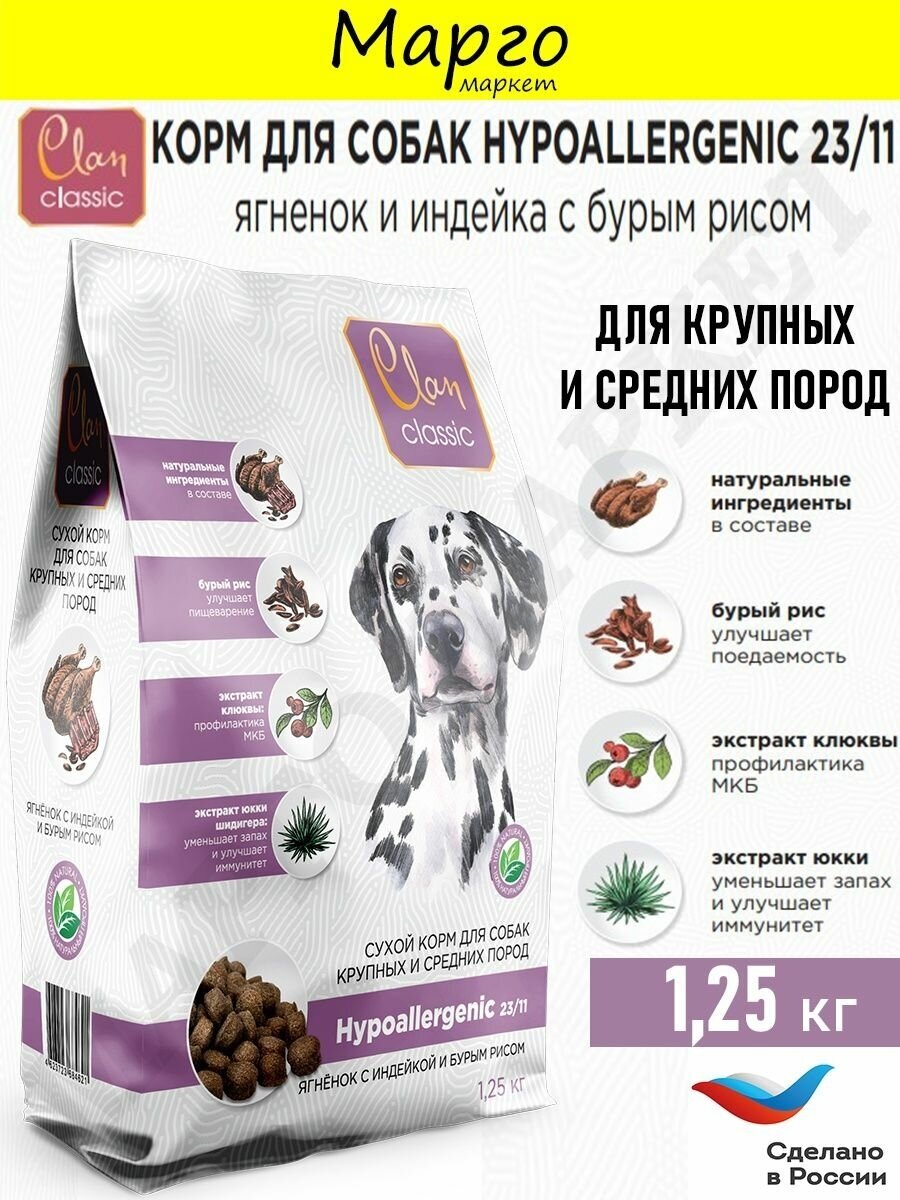 CLAN CLASSIC Hypoallergenic-23/11 Сухой корм для собак средних и крупных пород гипоаллергенный 1,25 кг с ягненком, индейкой и бурым рисом