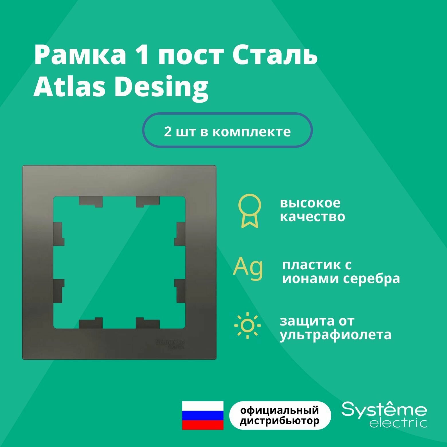 Розетки Рамка для розетки выключателя одинарная Schneider Electric (Systeme Electric) Atlas Design Антибактериальное покрытие Сталь ATN000901 2шт