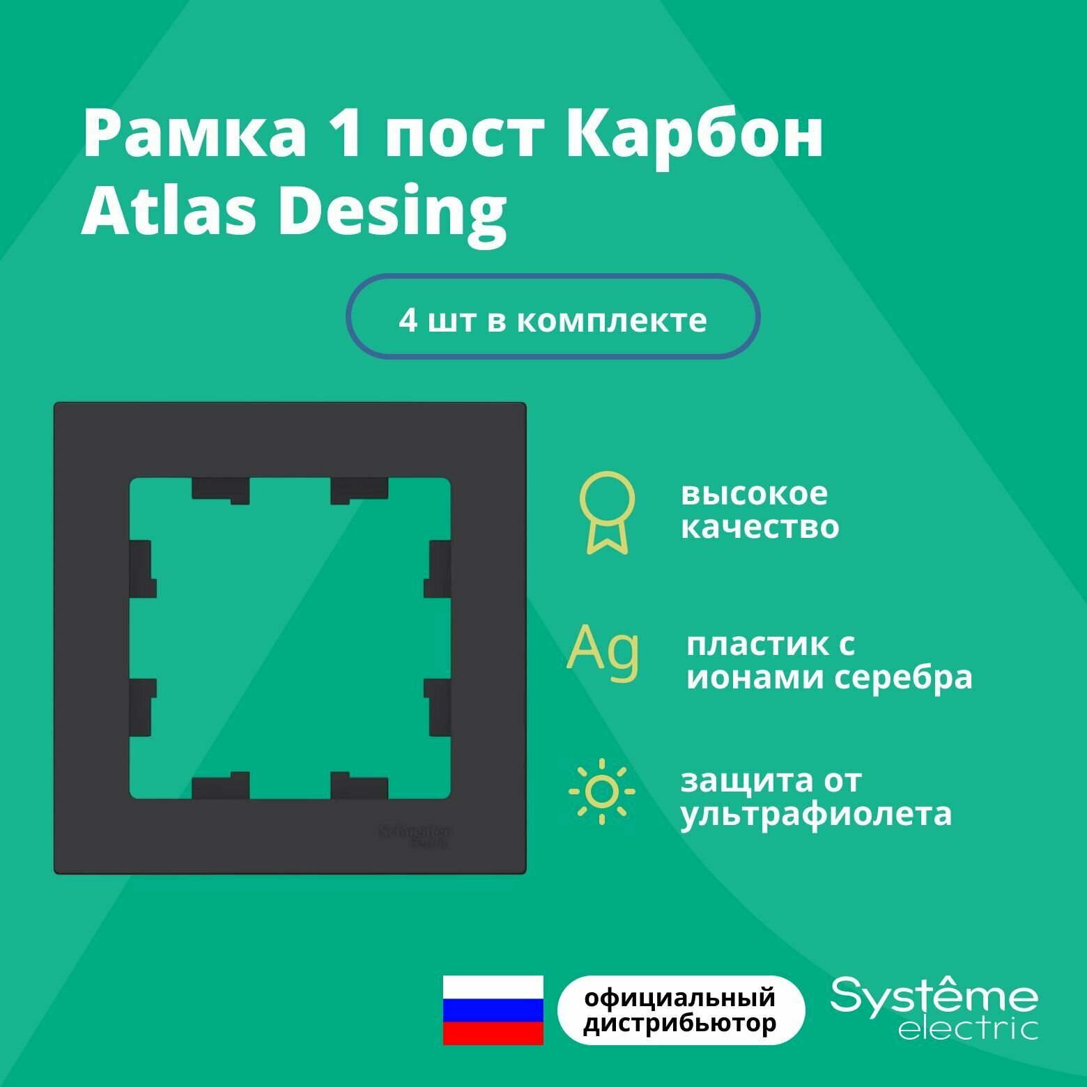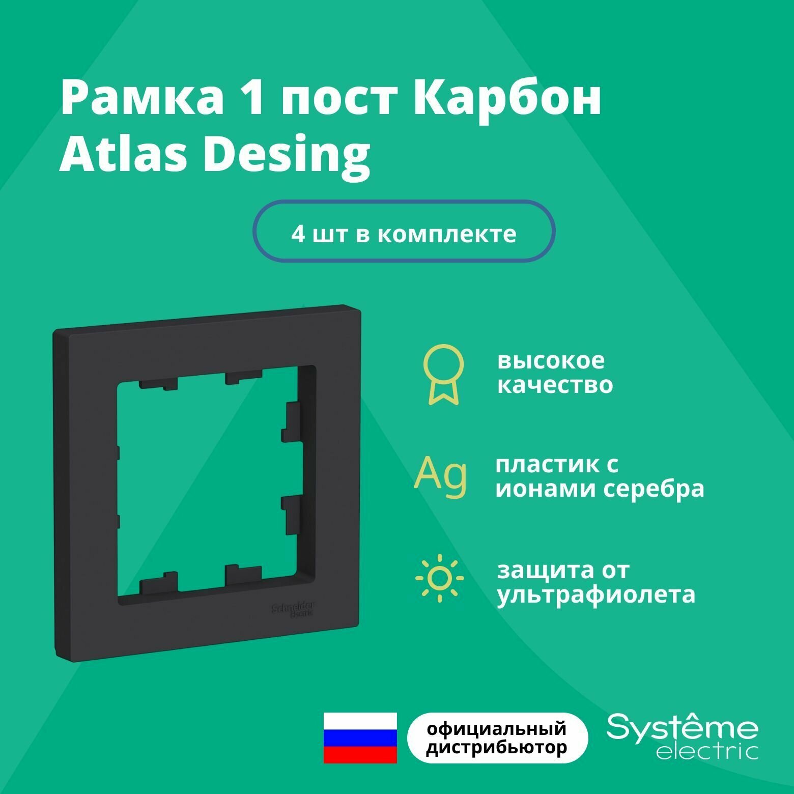 Розетки Рамка для розетки выключателя одинарная Schneider Electric (Systeme Electric) Atlas Design Антибактериальное покрытие Карбон ATN001001 4шт