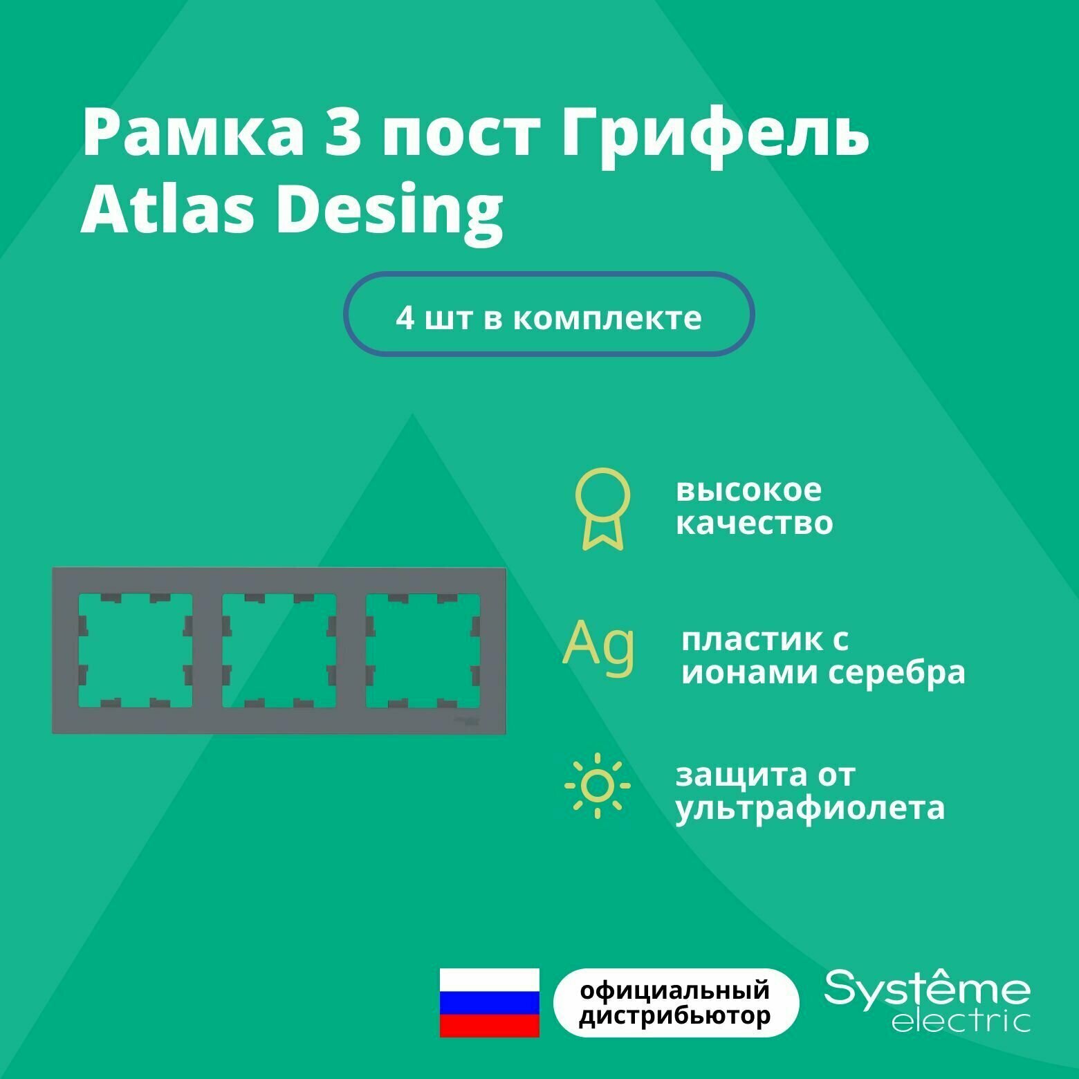 Розетки Рамка для розетки выключателя тройная Schneider Electric (Systeme Electric) Atlas Design Антибактериальное покрытие Грифель ATN000703 4шт
