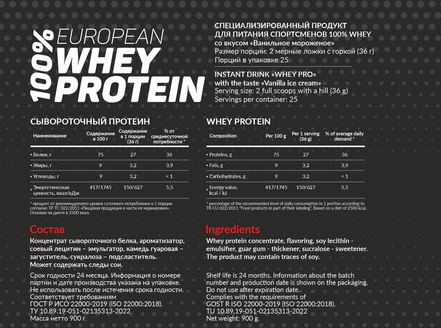 Протеины Напиток растворимый "ВЭЙ про" Be Steel Nutrition 100% European Whey Protein 0,9кг (ванильное мороженое)