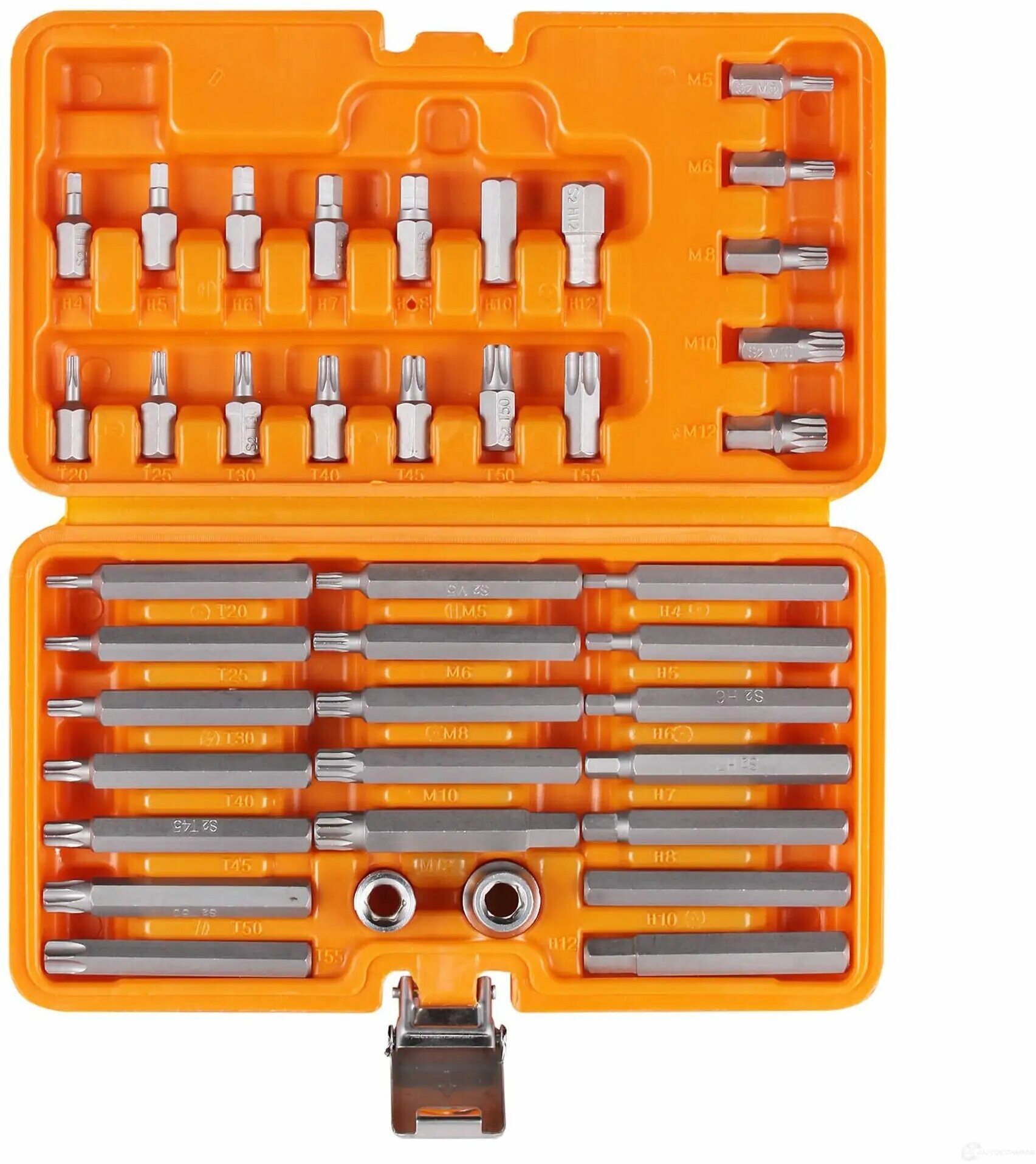 Лучшие цены. Набор бит вставок TORX, SPLINE, HEX 3/8" 30мм и 75мм с держателями бит 1/2" и 3/8" DR 40 предметов в кейсе Описание: Бита вставка изготовлена из особо прочной специальной стали S2 методом горячей ковки, что придаёт им высокую прочность и долговечность. Твёрдость: 58-62 HRC. Характеристики: Артикул: AT-B-52 OEM номера: 626940, 40640, S29H4140S, 953240 Размер: Биты 30мм (по 1 шт.): HEX: 4, 5, 6, 7, 8, 10, 12 mm TORX: Т20, Т25, Т30, Т40, Т45, Т50, Т55 Spline: М5, М6, М8, М10, М12 Биты 75мм (по 1 шт. Магазины в вашем городе.