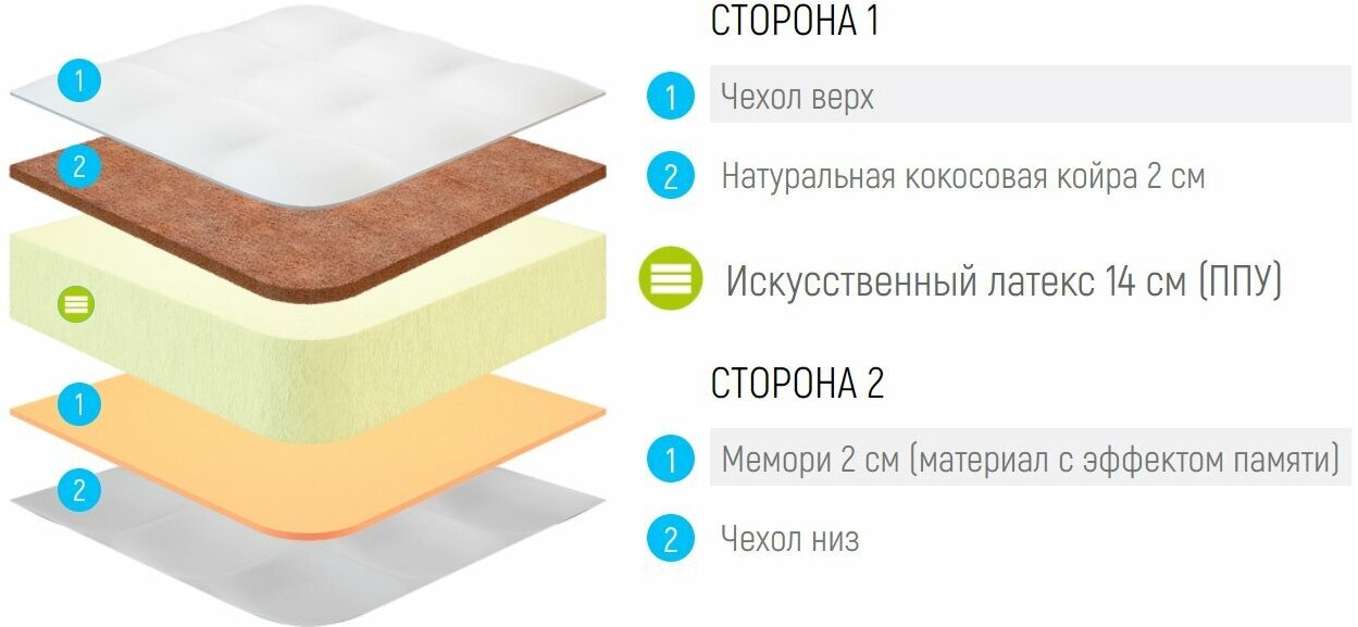 Лучшие цены. Анатомический матрас с двумя сторонами жёсткости. Он подарит вам здоровый, крепкий сон. Вы сами сможете выбрать удобную для вас поверхность. Модель понравится ценителям комфортного отдыха. В основе изделия лежит монолитный блок искусственного латекса. Он отлично заменяет пружины. Ортопедичность усиливает кокосовая койра. Кокос добавляет ровности и твёрдости. Поддерживает позвоночник в естественном положении. Поможет подкорректировать осанку и исключит развитие заболеваний спины. Магазины в вашем городе.