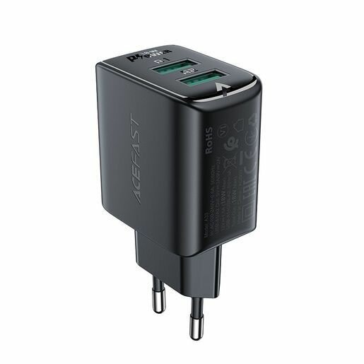 Лучшие цены. Зарядное устройство двухпортовое ACEFAST A33 QC18W USB-A+USB-A dual port charger (EU). Цвет: черный; Материал: огнестойкий поликарбонатный материал; Выход: USB-A 1/2: 18 Вт (QC/FCP/AFC); А1+А2: 5В/3А; Размер: 81,8*28*43,7 мм; Вес: 56 г. Магазины в вашем городе.