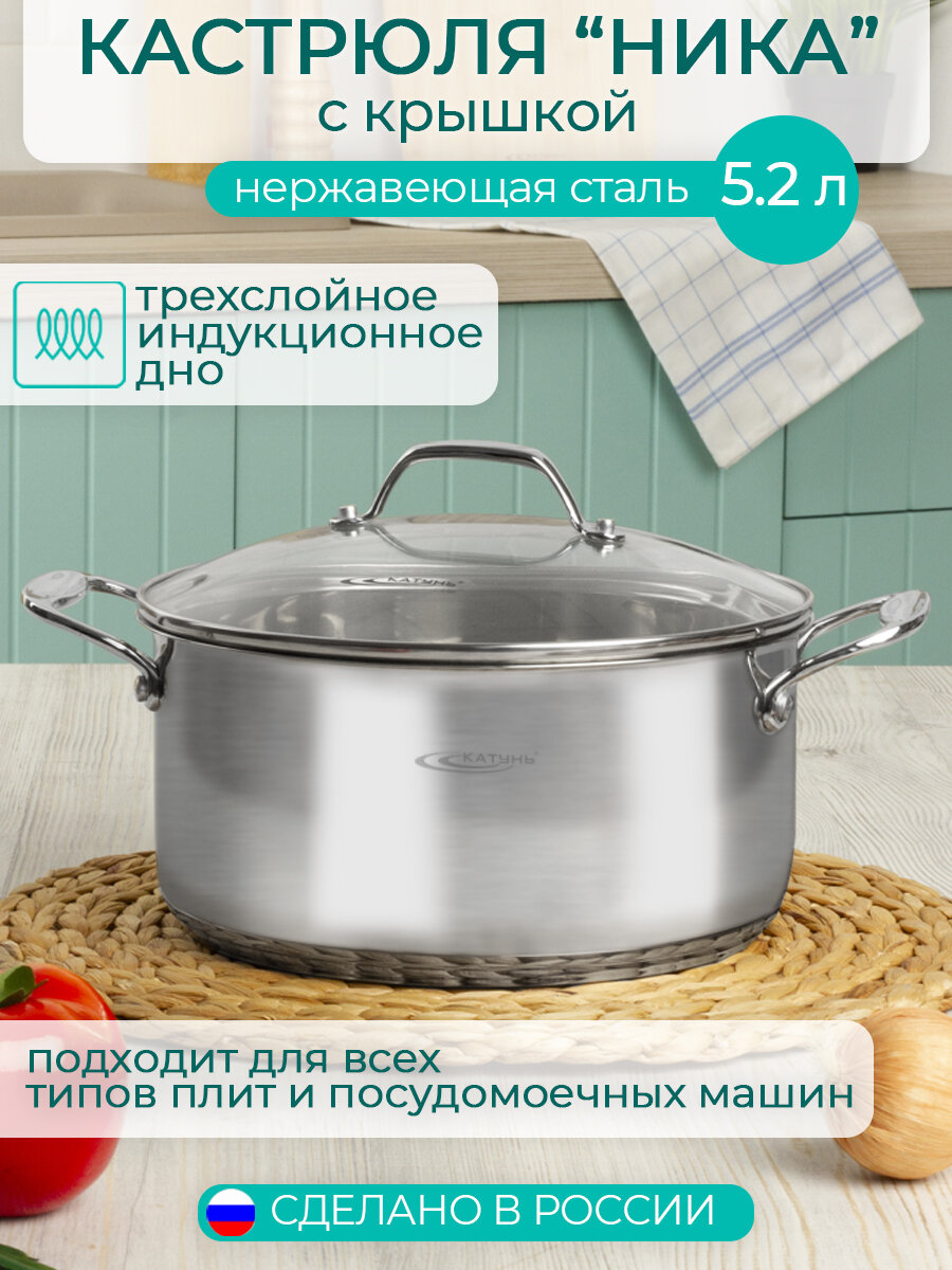 Кастрюля Кастрюля 5,2 л катунь, НИКА, КТ02-D-52, нерж.сталь, зеркальная полировка