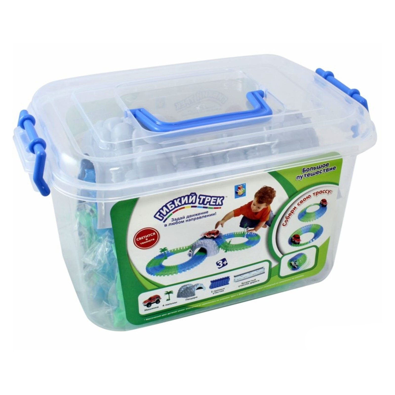 Лучшие цены. Наборы серии "Гибкий трек" задают новый тренд традиционной игре с машинками. Дорогу можно не просто собрать так, чтобы она поворачивала и петляла в разные стороны, но также сделать выпуклой или вогнутой или вообще "закольцевать", заставив машинку ехать внутри нее. Автотрек "Большое путешествие" от производителя 1 TOY заинтересует многих мальчиков. Представленный игровой набор включает в себя элемент для постройки длинного и полного крутых и опасных поворотов пути и машинку. Магазины в вашем городе.