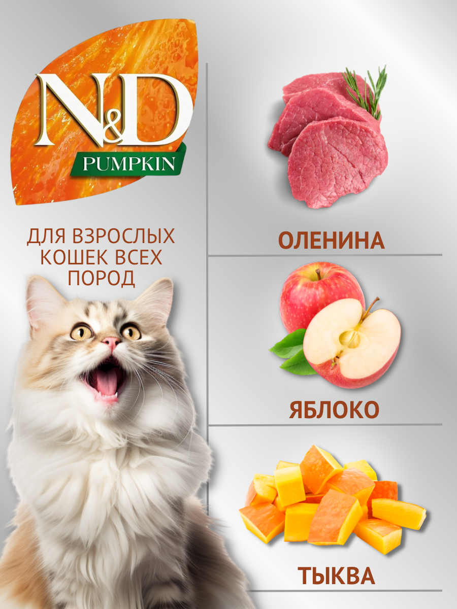 Лучшие цены. FARMINA N&D CAT Pumpkin полноценный сбалансированный беззерновой корм для взрослых кошек с олениной, тыквой и яблоком 96 % ингредиенты животного происхождения 0 % искусственные консерванты 0 % зерно Тыква – это традиционный овощ итальянской кухни с уникальными питательными элементами и множеством полезных свойств: Снижает риск развития сахарного диабета за счет низкого гликемического индекса Источник бета-каротина и природных антиоксидантов Поддерживает иммунную систему Нейтрализует действие свободных. Магазины в вашем городе.